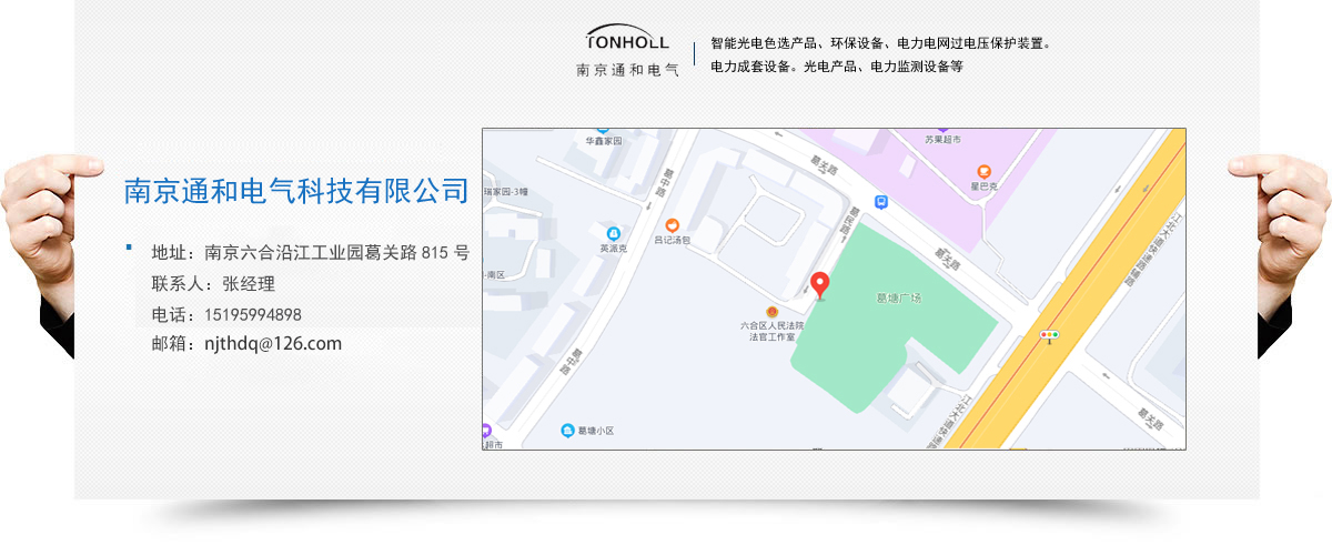 南京通和電氣科技有限公司是致力于研發、 生產防雷產品的科技型企業。公司集研發、生產、銷售、服務為一體,目前主要產品為:智能光電色選產品、環保設備、電力電網過電壓保護裝置。電力成套設備。光電產品、電力監測設備等。公司秉承“誠信。創新、和諧。卓越”的經營理念,研發創新的專業態度服務客戶,追求卓越,以其高水準的產品品質和良好的企業信譽,在發展進程中得到了社會廣泛認可。